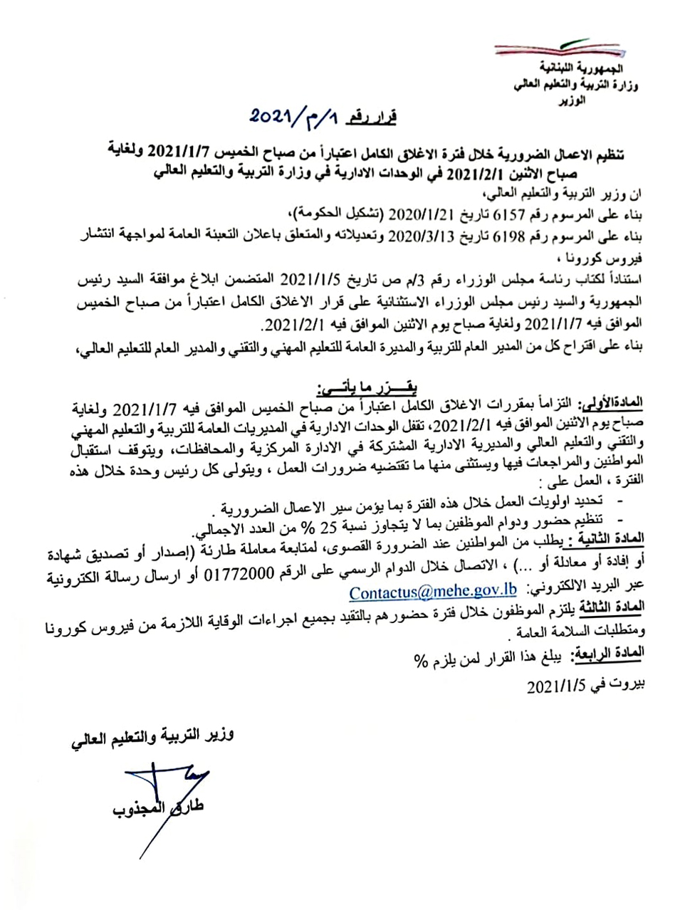 تنظيم الاعمال الضرورية خلال فترة الاغلاق الكامل اعتباراً من صباح الخميس 7/1/2021 ولغاية صباح الاثنين 1/2/2021 في الوحدات الادارية في وزارة التربية والتعليم العالي